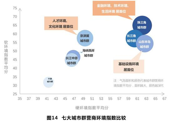各个城市群营商环境的主要驱动因素存在差异。在七大城市群中,珠江三角洲坐拥沿海区位优势和广东省重要的金融资源和科技资源,金融环境、技术环境和生活环境均位列首位;山东半岛城市群具有良好的工业产业基础,综合交通网络较为发达,人均基础设施环境排名居首;而京津冀城市群则依托北京的辐射和带动作用,对于人才有着强大的虹吸效应,在文化交流、国际交往方面形成优势,人才环境和文化环境指标均列第一位。