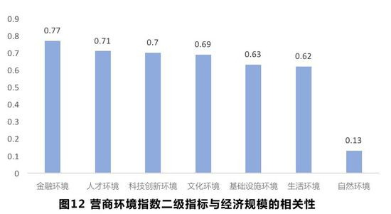从城市营商环境指数7个二级指标来看,金融环境、人才环境、技术创新环境、文化环境、基础设施环境、生活环境、自然环境与经济规模的相关性分别为0.77、0.71、0.70、0.69、0.63、0.62和0.13,所有二级指标均与经济规模呈现正相关关系,其中金融环境相关性最高,人才环境、技术创新环境和文化环境仅次于金融环境,自然环境相关性最低。