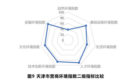 天津的城市营商环境指数总分为80.06分,名列第八,其中硬环境指数排名第15位,软环境指数位列八。从二级指标来看,天津的基础设施指标最为突出,排名第三,其中排水管道密度、生活垃圾无害化处理率、天然气普及度、公路货运量等三级指标均排名前十。天津一直致力于建设富有创造活力的文化强市,重视图书馆、博物馆、歌舞剧院等公共文化服务体系的建设,文化环境指标排名第五,其中反映政府投入力度的文化教育支出占比指标位居第三。