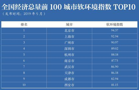 根据软环境指数评价结果,在中国经济规模排名前100的城市中,2019城市软环境指数排名前十的分别为北京、上海、广州、深圳、杭州、南京、武汉、天津、成都、西安。此次评价结果显示,软环境指数排名前十的城市与营商环境指数排名前十的城市高度一致,软环境成为决定城市营商环境竞争力的关键因素。