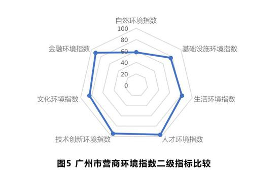 广州本地人才供给优势明显,营商环境指数总分为83.32分,名列第四。其中软环境指数位居第三位,仅次于北京和上海,5个软环境二级指标均位列前十。人才环境指标排名第三,其下三级指标中,本地人才供给指标位居第一,本科以上人才、科研人才、大学数量等指标均列全国前五。生活环境排名第二,其下三级指标中,就医便利度、就学便利度分列第五和第六。硬环境指数排名第九,其中城市排水管道密度、公共汽车密度等三级指标均位居全国前十,但人均道路拥有面积排名较为靠后。