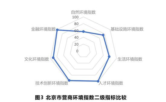 北京软环境指数排名居首,受自然环境影响,营商环境指数位列第二。北京城市营商环境指数总分为84.63分,其中软环境指数位居全国榜首。在金融环境、人才环境、技术创新环境、文化环境、生活环境等5个二级指标中,北京均排名前三,其中人才环境和金融环境优势最为明显,位列全国首位。在24项软环境三级指标中,北京的科研人才供给、政府文教投入力度、大学数量、学术文化、服务市场规模、技术成果储备等12项指标均位居首位。但受到空气质量、气候环境、森林覆盖率等自然环境的制约,北京硬环境指数排名较为靠后。