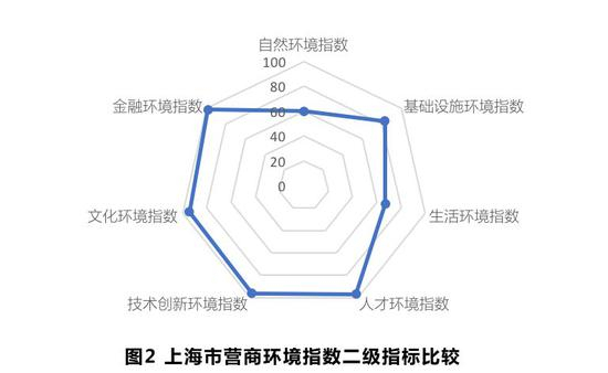 七成指标排名前五,助力上海夺魁。上海城市营商环境指数总分为86.73分,其中软环境指数和硬环境指数均排名第二,基础设施环境、人才环境、技术创新环境、文化环境和金融环境等5个二级指标均进入前三,其中基础设施环境和文化环境排名第一。在35个三级指标中,高端人才供给、政府文教投入力度、外资吸引力、直接融资、间接融资、消费市场规模等18个指标均列全国前三,有近七成的指标位列全国前五,其软硬环境的综合优势明显。