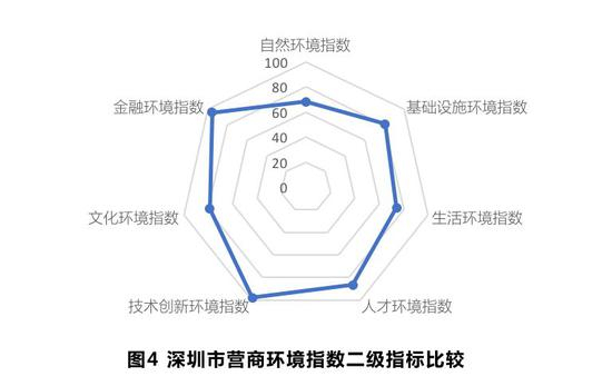 深圳硬环境指数位居第一,技术创新环境领跑全国。深圳城市营商环境指数总分为84.48分,其中硬环境指数排名第一,软环境指数排名第四。深圳在经济发展速度与环境质量改善两方面实现了良好的平衡,在全国GDP排名前20位的城市中,深圳的空气质量排名第一。深圳一直把创新驱动作为城市发展的主导战略,工程实验室、工程研究中心等各类创新机构数量、技术专利数量、科研支出等居全国前列,技术创新环境名列第一,其中技术人员数量位居全国第二,仅次于北京。但在人才环境方面,本地高等学校毕业生数量、大学数量等仍有可提升的空间。