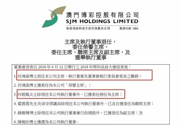 2018年6月,何鸿燊正式退任公司主席、执行董事及董事会执行委员会委员职务,全面退出董事会。最终,信德由二房长女何超琼管理,二房次女何超凤则管理澳博集团。也就是说,何鸿燊的所有博彩事业几乎为二房继承。这家港产豪门的大戏也终于落下了帷幕。
