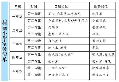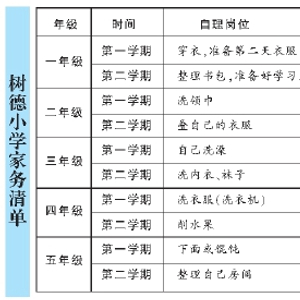 晨报记者 李星言 上海市普陀区树德小学有一项特别的作业——“做家务”,还正式印制在了《作业本》上,孩子们回家后,要学着帮忙摆放餐具、擦桌子、叠衣服、整理书桌……还会获得正式评价。 中高年级对烹饪兴趣很高 校长梁青云告诉记者,其实这个创意起源于该校2016年的一个德育项目,“现在很多孩子都生活在优越的家庭环境中,基本是‘小皇帝小公主’式的生长环境,家长只在学习方面要求比较高。但是,如果让孩子们承担一定的家务,从小事做起,从小家做起,能让他们更好地体验家庭的责任感,以后才会在社会这个大家庭里承担更多的义务,或者承担起更多的责任,所以我们觉得有必要设置一份‘家务清单’”。 梁青云介绍,通过梳理,学校在学生一至五年级的每个学期中都列了家务项目,引导小朋友在家中积极践行自己的家务岗位,还把这份特别制定的“家务清单”印刷在《树德作业本》首页,鼓励学生在家庭寻找服务的小岗位,主动参与家务劳动,学会一些劳动的技能技巧,而在作业记录后面还印上了“家务完成情况”评价表,家长需要在“家务完成情况”评价表内“打分”。 学校根据孩子的不同年龄特征,列了10项他们力所能及的劳动。梁青云介绍,孩子们最擅长的是扫地、整理书桌、洗碗,而洗衣服、叠被子、整理被套的完成情况则稍逊。不过,让她有些意外的是,中高年级的孩子们对烹饪的兴趣很高,学校曾经布置过一项作业,让孩子们自己料理三菜一汤,许多孩子都完成得很好。 这项“家务作业”也让孩子们发生了变化,该校三(二)班的汪裕佳同学介绍,“每周的周一、周三、周五,我都会帮着家人做家务,比如烧一顿晚餐,牛排、西餐、意大利面、薯条、肉丸等。通过这件事我体会到了家里人的不易,所以我要做到自己的事情自己做,家里的事情帮着做”;二(4)班聂浩轩同学的家长则开心地拍下了孩子端着自己烧的菜上桌的照片;四(1)胡静仪妈妈则觉得,“孩子长大了懂事了,懂得心疼父母了”…… 家长建立劳动教育意识 不过,“劳动作业”的推进,也并非一帆风顺。事实上,老师们发现,有些成绩很好、父母都是高级知识分子的家庭,反而不愿意督促孩子做劳动作业。 梁青云自己就带过一个班,班上有个孩子,学习成绩很好,但在劳动作业的家长记录那一栏,一直都是空白。家长直言,孩子每天都要上各种机构或者学习才艺,比较辛苦,所以家里不希望孩子再做家务,只要成绩好、才艺出众就可以了。 “家长的想法可以理解,这确实也代表了一部分高年级家长的感受”,梁青云坦言,所幸,学校依然坚持将这个做法推行了4年左右,目前绝大多数孩子都能积极主动地完成劳动作业,家长也非常配合,“学校不会硬性要求,但目前来看,大多数家长已经建立了劳动教育的意识,孩子也以能帮家庭承担一定的责任为荣,这种意识的建立,对孩子的成长其实大有裨益。” 据悉,该校每个学期还会举办“家务大比拼”的活动,评出“最佳小当家”。正是在这点点滴滴的浸润中,孩子们的劳动意识和家庭责任意识也有了明显的提升。 中小学劳动教育各有特色 记者获悉,其实上海已经有不少中小学把“劳动教育”玩出了各种学生、家长欢迎的“新花样”。如虹口区教育学院附属中学开发了《万物有灵》劳动实践课程,从生活中常见的中草药入手,通过“认一认”“种一种”“养一养”“画一画”等形式,不仅让学生了解中医药知识中蕴含的中华传统文化,更注重让学生学会基本的劳动知识和技能;嘉定区娄塘学校则开设了娄塘点心制作班,还开设全校同学都必须掌握的“5+1”系列劳动技能课程,“5”指“一汤一点一菜一凉一蛋”课程,“1”指“一扣”,即钉纽扣,让孩子在劳动教育中增强独立自主的能力。 据悉,目前,上海正在制定加强大中小学幼儿园劳动教育的实施意见以及配套的教育指导纲要,分学段细化学校教育、社会实践、家务劳动等各环节的劳动教育内涵,系统化构建学校社会家庭的协同机制,使劳动教育落细落小落实。 |