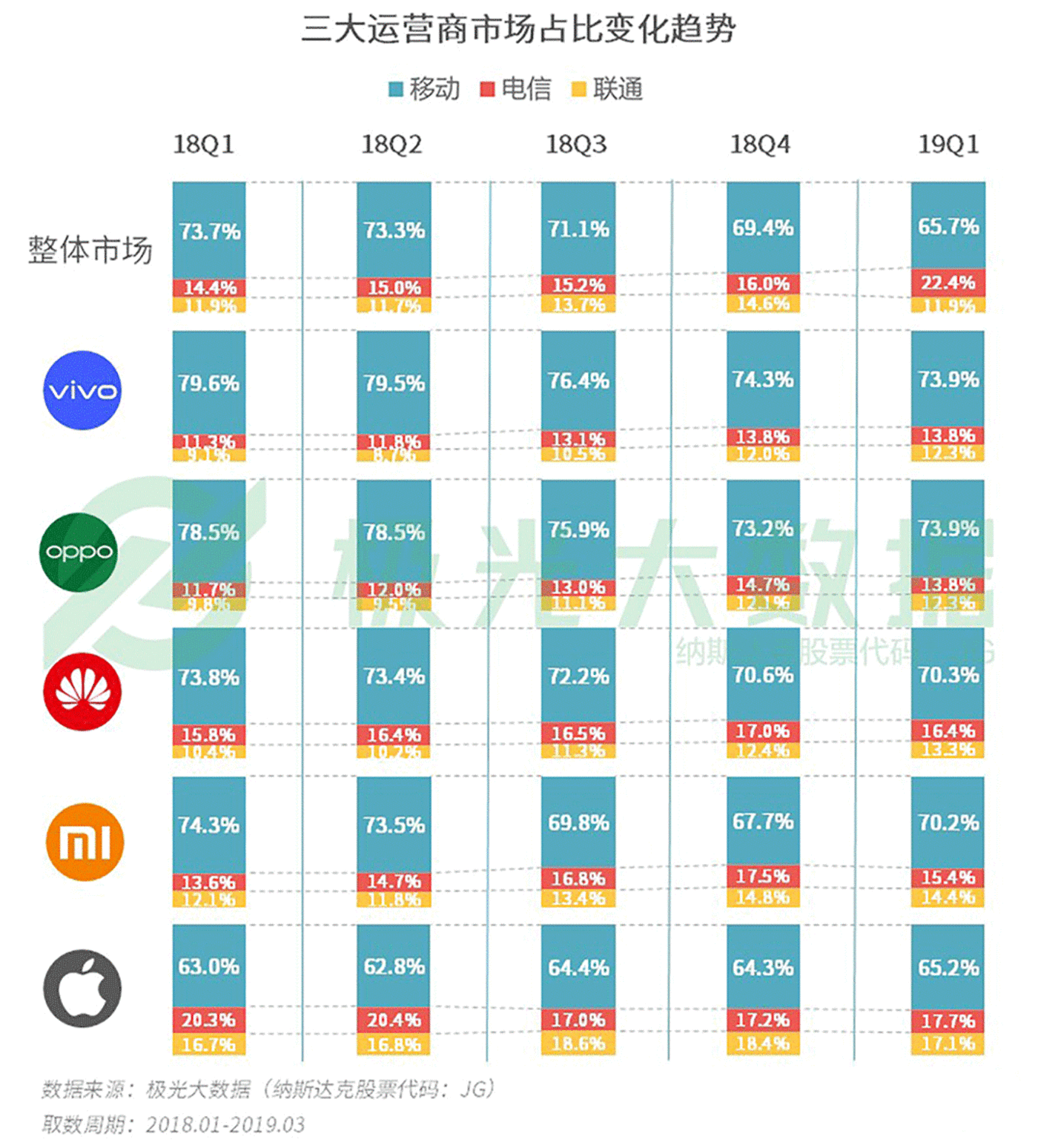 极光大数据显示,电信市场占比在2019年Q1进一步扩大。
