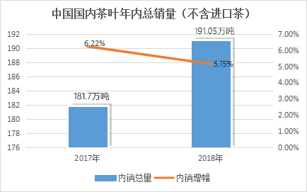 数据显示,2018年国内茶叶内销量(不含进口茶)增幅5.15%,同比下降1.05个百分点。
