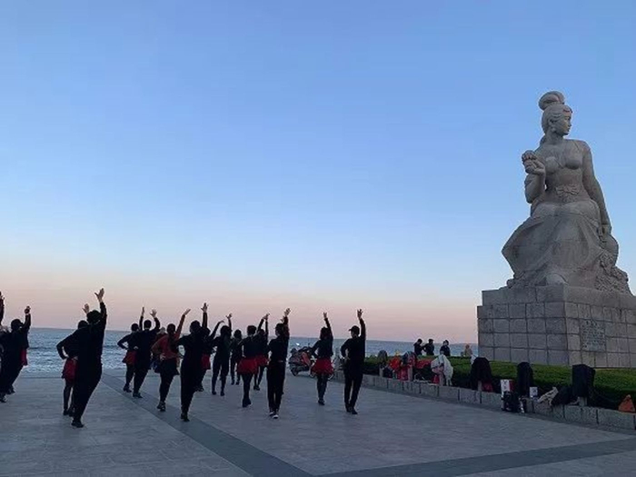 傍晚,兴城居民在“菊花女”雕像旁跳广场舞 拍摄:张馨予