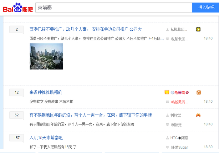 澎湃新闻(www.thepaper.cn)调查发现,除柬埔寨吧外,柬埔寨金边吧、柬埔寨西港吧、柬埔寨工作吧等百度贴吧内,存在大量以“招收推推、小白”、“新盘口、有意私聊”、“坐标西港、波贝”等为暗语的招赌信息。