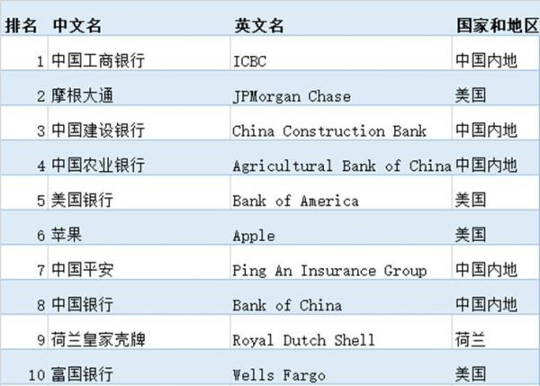5月16日,美国《福布斯》杂志发布了2019年“全球上市公司2000强”排行榜。在榜单Top10当中,中国企业5家,美国企业4家,荷兰1家。中国首次成为Top 10榜单中拥有企业最多的国家,占据了半壁江山。中国“四大行”(工行、建行、农行、中行)悉数进入前十,中国平安则是“四大行”之外,唯一进入Top 10的中国非国有企业。