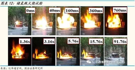 ■ 储氢瓶火烧试验:将储氢瓶进行火烧,氢气燃烧前一秒火焰最大,一秒之后火焰骤降,基本5-15秒后火焰熄灭,最重要的一点,即便是火烧氢瓶,储氢瓶依旧没有出现爆炸。