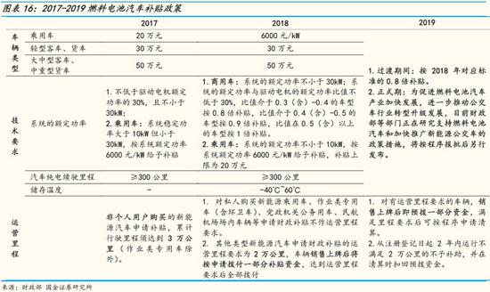 当前燃料电池补贴力度较大,当前燃料电池汽车单车补贴金额较高,以中重卡为例,2018年国补50万/辆,2019年过渡期国补40万/辆;很多地方补贴比例达到1:1,如上海、深圳、武汉和佛山等地。