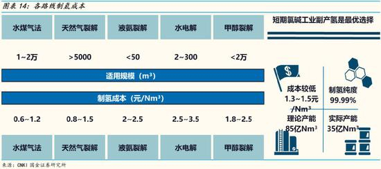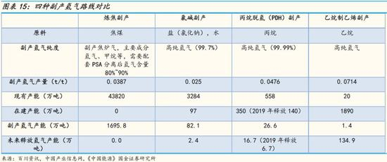 副产氢丰富,并且副产氢产能持续增加。传统的炼焦行业、氯碱行业,以及近几年大量新建的丙烷脱氢、乙烷制乙烯项目,都会副产大量氢气。使用副产的氢气,不需要投入过高的固定成本,仅需投入分离提纯成本和运输成本,即可直接采用。根据测算,目前副产氢年产能可达1806万吨,其中炼焦副产氢1695.8万吨,氯碱副产氢82.1万吨,PDH副产氢26.6万吨,乙烷制乙烯副产氢1.4万吨。