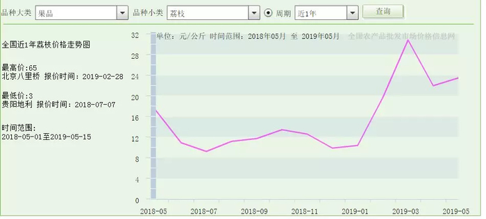 而从近一年的数据来看,荔枝价格的高点在2019年2月28日的北京八里桥市场,报价65元每公斤。而最低点则是2019年5月15日贵阳地利市场的报价,仅为3元每公斤。