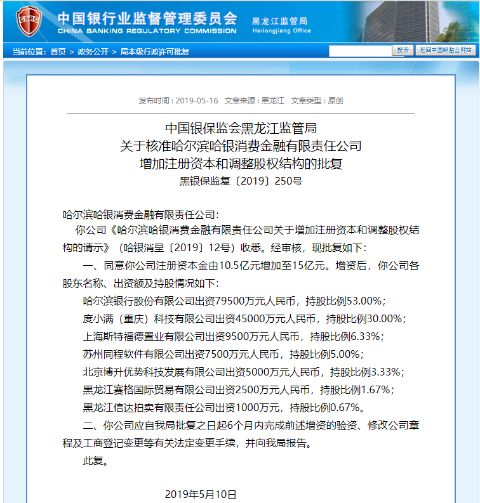 官网资料显示,哈银消金是一家由哈尔滨银行作为主要发起人的银行系消费金融公司,于2017年4月11日正式开业,是业内第19家开业的消费金融公司,注册地在哈尔滨。哈银消金初始注册资本为5亿元,于2018年进行一次增加注册资本与调整股权结构,注册资本增至10.5亿元。