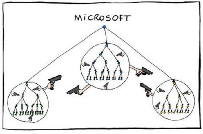 2、优化流程,微软通常每年7月份宣布裁员计划,以配合新财年的战略规划。鲍尔默时期的组织内部竞争激烈,团队注重短期目标,具有代表性的就是2011年一张微软组织结构拿着手枪对战的讽刺图意外走红。2016年纳德拉重组新结构后,大程度消除了业务流程中存在的问题,不仅增加了业务灵活性,而且节省了财务资源。