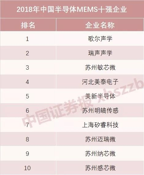 半导体MEMS领域,歌尔声学和瑞声声学的名次较2017年未发生变化,分列第一、第二;苏州敏芯微电子技术有限公司从第五名跃居至第三名;华虹宏力半导体参股企业上海矽睿科技有限公司排名第七;已从新三板的摘牌的苏州纳芯微电子股份有限公司排名第九。