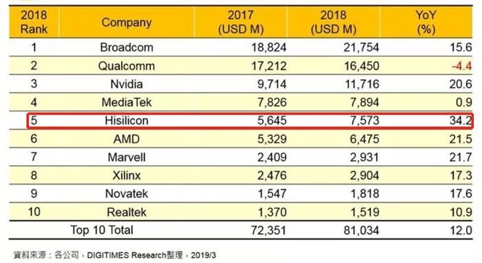 据DIGITIMES的数据,2018年海思收入近76亿美元,同比增长34.2%,还入围了2018年全球十大集成电路设计公司,排名第五。