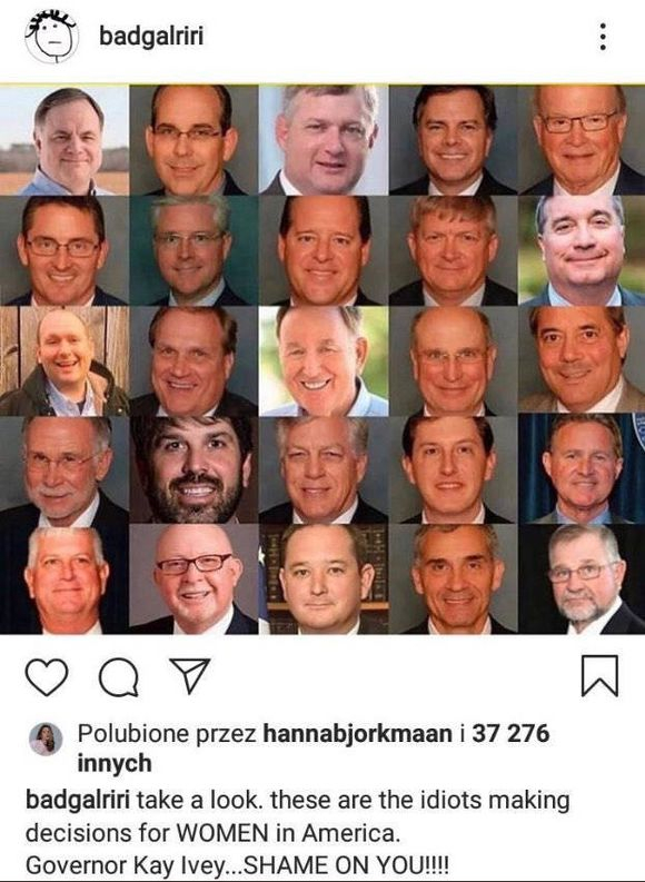 另一位歌手蕾哈娜(Rihanna)则直接将投票支持阿拉巴马州新堕胎法案的全部25名男性州参议员头像发在她的Instagram上说:“看看,就是这些白痴在为美国女性做决定”,同时蕾哈娜指责女州长凯·艾维“无耻”。