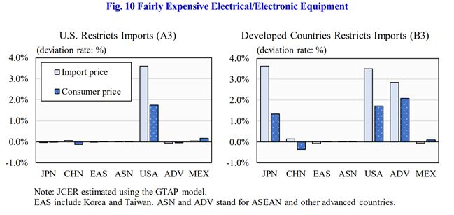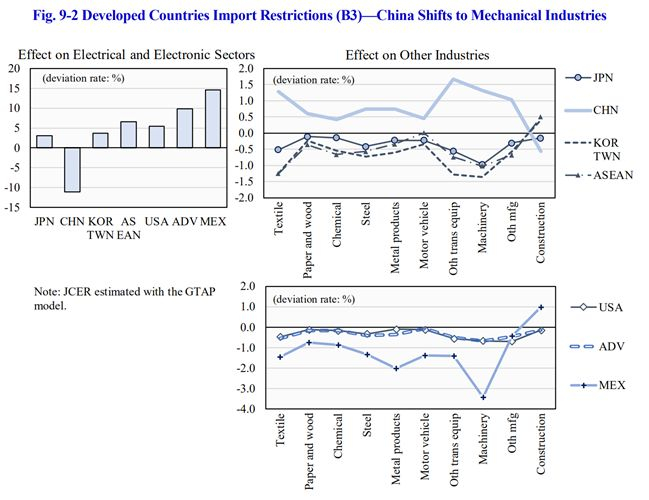 在中国,纺织、其他运输机械和通用机械行业将会增长。随着这些行业向其他国家的电气和电子行业转移,其它运输机械和通用机械将出现短缺,为中国的出口留下了空间。韩国、台湾、东盟和墨西哥将取代中国成为电子电气设备的供应商,这一角色过去一直由中国承担。在短期内(投入产出表分析),韩国和台湾将受到零部件供应减少的负面影响,但电气和电子行业将在中期内反弹。在美国,电气和电子部门将增长,而其他工业部门将略有下降。如果美国是唯一实施限制的国家,日本几乎看不到任何影响,但如果所有发达国家都限制进口,其影响将与美国相同,电气和电子行业及其他行业的增长将低于基准水平。