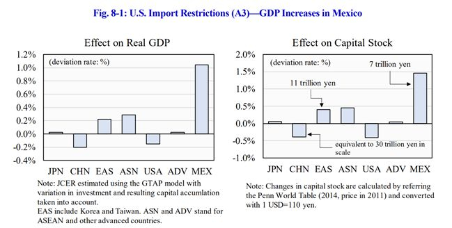 另一方面,韩国、台湾、东盟、墨西哥等国的GDP将会增长,取代中国的生产。根据这一模型,资本将转移到预期回报率较高的地区。