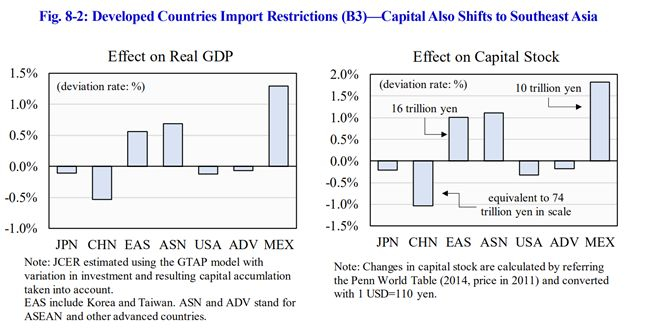 资本将从盈利状况将会恶化的中国转移到生产回报率会上升的地区。在美国的限制下,中国的资本存量与基准的偏离率将下降0.4%,但如果发达国家也采取同样的措施,则会下降1.0%。如果换算成货币数额,则分别减少30万亿日元和74万亿日元。墨西哥增长速度如此之快的原因是经济规模相对较小,而韩国和台湾的资本变动规模将会发生较大的变化。