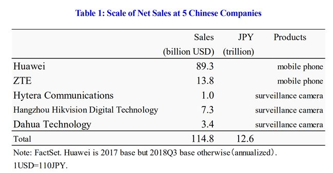 接下来,我将尝试估算中国以外地区的经济影响。首先,我将确定这五家公司的净销售规模。华为是其中规模最大的(表1),中兴通讯的规模约为华为的六分之一。生产监控摄像头的三家公司的净销售额超过100亿美元。这五家公司的总净销售额约为1,150亿美元,按110日圆兑1美元的汇率换算,达到12.6万亿日圆。