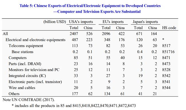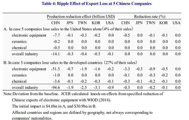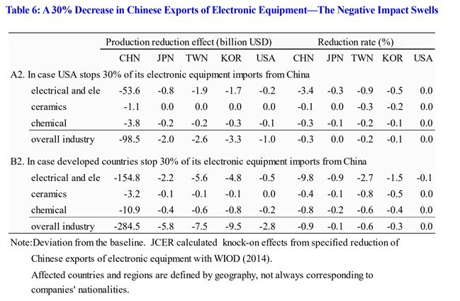 报告计算了中国出口的电子设备减少上述金额比例的连锁效应(表4),例如仅在美国的销售损失情况下(表4),在中国整体工业生产将下降140亿美元,但不会有明显的影响偏离基线的速率。