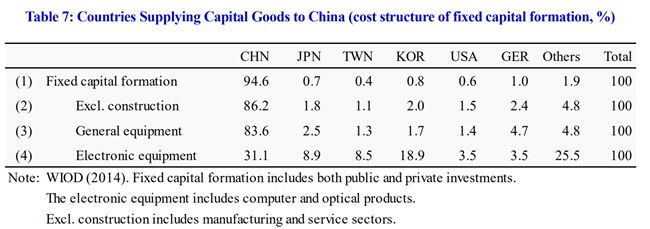 报告发现,首先,固定资本的形成既包括公共投资,也包括私人投资,与建筑有关的成本很高。因此,95%的资金来自国内(表7(1))。预计任何投资减少的举措,都将在很大程度上冲击中国本土经济。然而,如果不考虑建筑业,依赖海外供应的比例将有所上升(表7(2))。就一般设备而言,中国的自给率为84%(表7(3)),但如果仅限于电子设备(表7(4),则国内采购率降至30%。在各国看来,日本和德国作为通用设备供应商的地位引人注目,而韩国作为电子设备供应商的地位则十分突出。