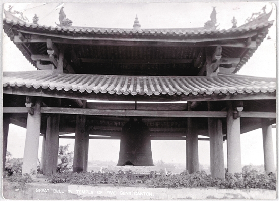 大殿后面是“岭南第一楼”,楼上挂着“岭南第一钟”,即“禁钟”。现在的禁钟为策安全,用钢筋吊,下面还用两根钢轨托着。老照片中的禁钟虽不可能如传说中说的用藤条吊起,但确实是腾空吊着,下面并无依托(见图11,雅真照相馆拍摄)。