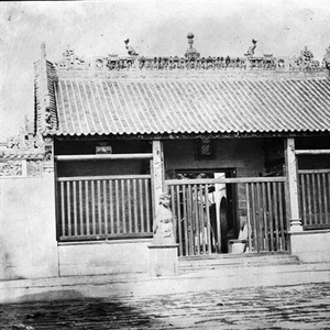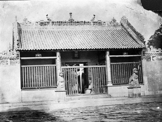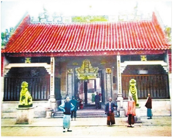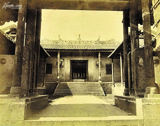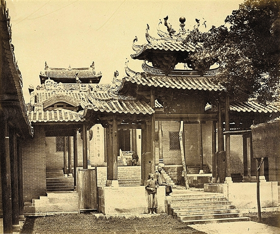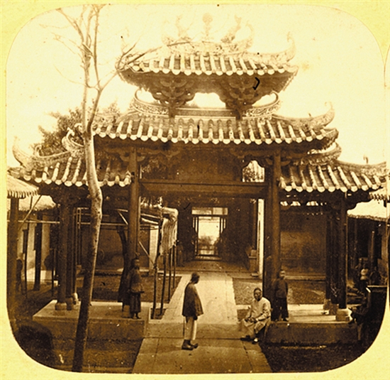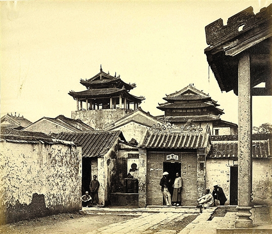 图1为英国业余摄影师约翰·克里斯拍摄于1858年。这是五仙观最早的照片,是1871年之前五仙门山门的样式。当时山门上挂的是竖写的“五僊(仙)观”匾额,似未有门联,但有一对明代石麒麟立于山门前。