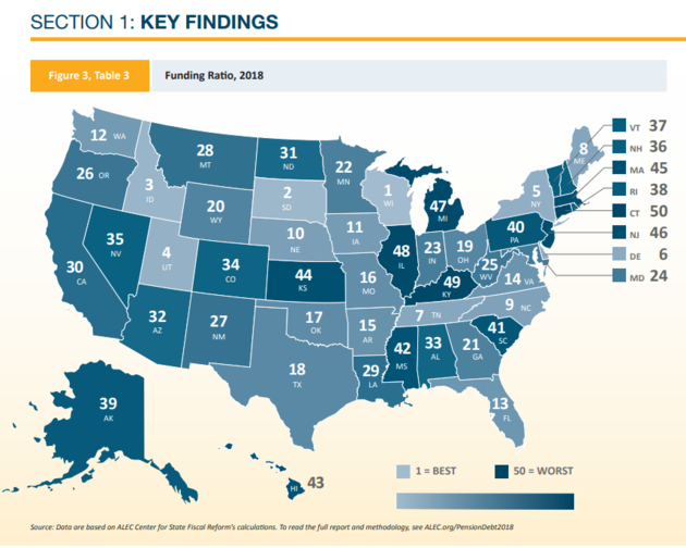 美国公共政策智库American Legislative Exchange Council(ALEC)今年3月发布的报告指出,如果使用“更加现实的投资回报假设”以及“适当的无风险贴现率”计算,那么美国公共养老金的无资金负债(unfunded liabilities)目前超过5.96万亿美元。