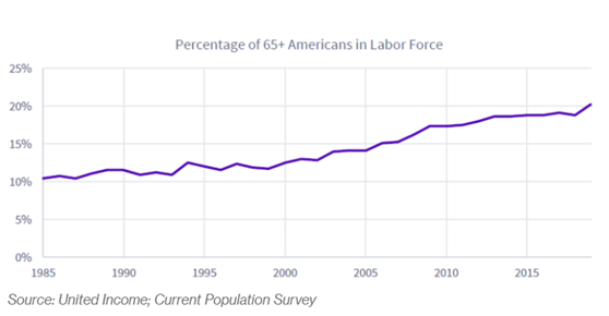 彭博此前援引美国资金管理公司United Income的一份报告表示,从1985年至今,美国超过65岁的老年人在劳动力市场的比例逐渐攀升,从最早的10%上升到最近的20%。