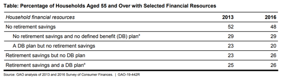 3月27日,美国政府问责局(U.S.GAO)发布的2016年美国退休储蓄报告显示,在55岁及以上的人群中,48%的人没有在任何养老金计划中存入一分钱,余额为零。其中,29%的人既没有雇主给他们交过养老金,也没有自己交过养老金。