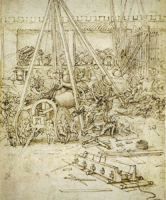 1482年,当时米兰正和威尼斯交战,达·芬奇写信给米兰公爵斯福尔扎,想应聘军事工程师,为保卫米兰贡献力量。他的信是这样写的:“我能造轻盈、结实的可搬运的桥梁,可用它追击并击败敌军;我也会造重量很轻、很容易移动的大炮,它可以像冰雹一样发射小石块;我能在任何地方的地下悄无声息地挖掘隧道,不管是直的,还是弯曲的,都能建,还可以让隧道从战壕和河流下面穿过;我还能造装甲车辆,让它拖运大炮,可轻而易举地突破敌人的阵地。在和平时期,我能建造房子,不管是公共房屋还是个人建筑,包你满意;我也能把水从一地引到另一地。”