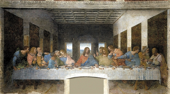 《最后的晚餐》宽8.8米,高4.6米,题材取自《圣经·新约·马可福音》第14章。逾越节那天,耶稣与12个门徒在耶路撒冷共进晚餐时突然说:“我实话告诉你们,你们有一个人要出卖我,他现在正和我同桌进餐。”门徒们听了都感到不安,每一个都争着问耶稣:“是我吗?”这幅画刻画的就是这一场景,每个门徒流露出不同的表情,或惊讶,或疑惑,或愤怒,或激动,或恐惧,既担心自己被怀疑,同时也猜测谁会是这个叛徒,人物表情精细入微,惟妙惟肖。可惜的是,这幅名画基底没处理好,不断脱落,被后世画家多次修复补画,现在已很难辨认出哪笔是达·芬奇的真迹了。