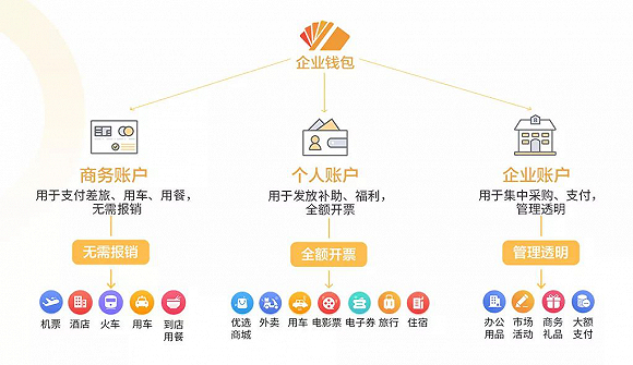 企业因公消费主要分为三大块:第一块是差旅出行类的机票、酒店、火车、打车等;第二块是企业用餐,比如加班叫外卖或商务宴请;第三块是企业内部的行政采购,或给员工发放福利如卡券、补助等。