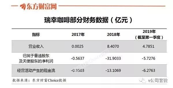 2019年第一季度亏损延续,净收入为4.79亿元人民币,归属于普通股东及天使股东的净利润为-5.73亿元,经营活动产生的现金流为-6.28亿元。而从2017年以来,瑞幸三年合计亏损高达38亿。