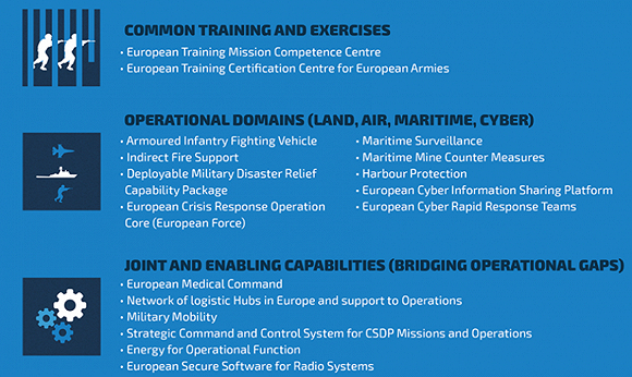 早在2016年,英国宣布脱欧后不久,欧盟各国就开始着手进行关于PESCO的谈判,并最终于2017年12月取得了除丹麦和马耳他之外其余成员国的一致认可。根据计划,欧盟各国将在PESCO的框架内更紧密地进行军事合作,其中就包含例如军用无人机标准、港口统一防务、无线电通讯标准等34个具体的军事项目。“军事意义上的申根区”以及“欧洲防务联盟和欧洲军的基石”更是直接被列为PESCO方案的愿景。