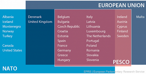 美国人矛头所指的,就是欧洲议会于不久之前投票通过的欧洲防务基金计划,以及一年半之前就获批的“永久结构性合作”防务方案(Permanent Structured Cooperation,下称PESCO方案)。