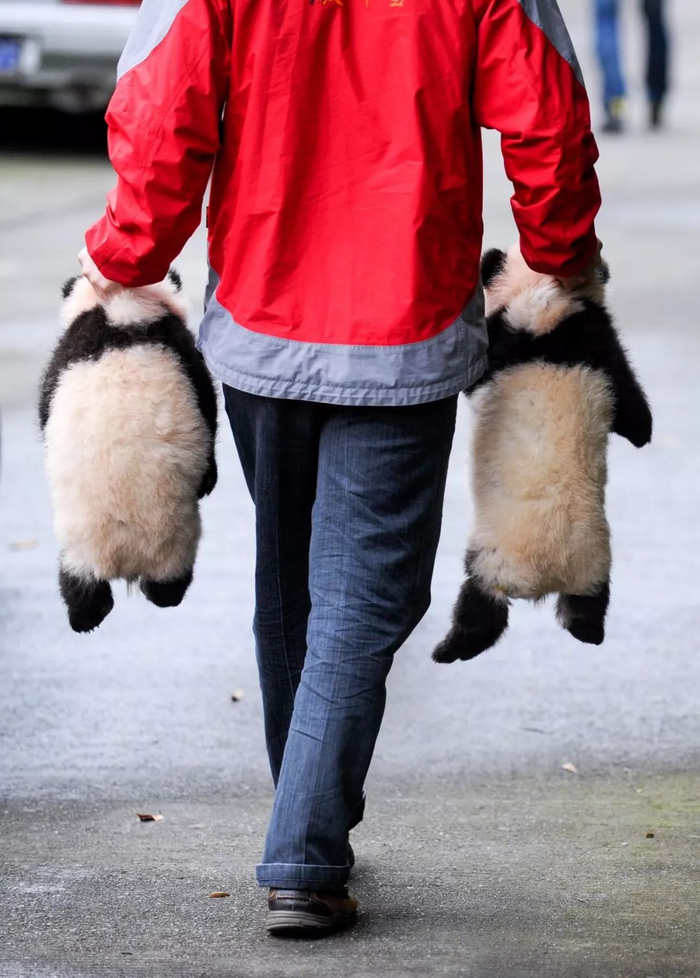 (扼住命运的后颈皮,两只大熊猫被雅安碧峰峡大熊猫保护中心的饲养员带回圈舍,摄影师@杨涛)