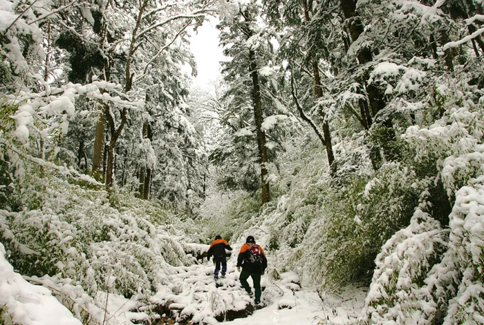 (这便是保护生物学上的一个重要概念:伞种;下图为大熊猫调查工作人员行走在王朗保护区的冰天雪地中,摄影师@王放/西南山地)