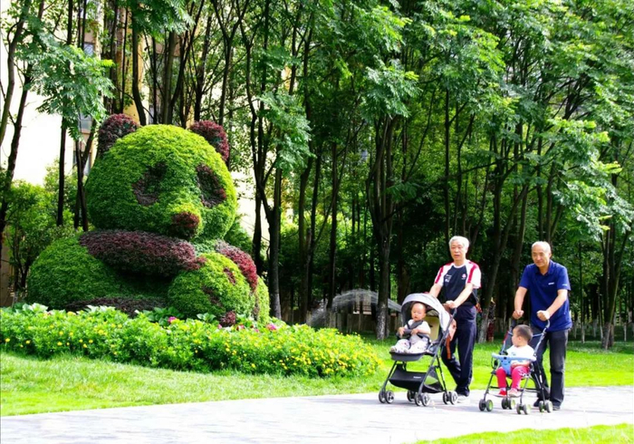 (成都南三环路熊猫绿道的熊猫主题景点,两位推车带小孩的老人从步道上经过,摄影师@曹省利)