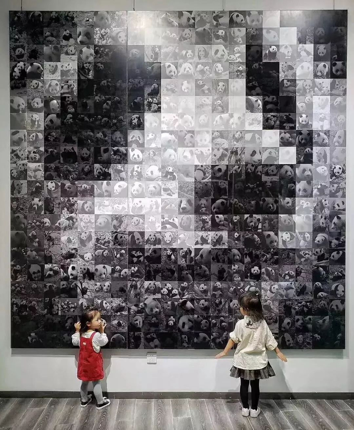 (拾野自然博物馆内两个孩子在由400只熊猫照片组合而成的照片墙前玩耍,摄影师@周孟棋)