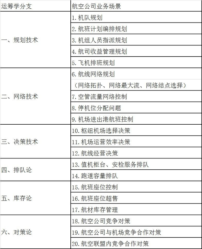 国外著名航空公司美联航UA、美航AA、英航BA、法航AF等等,高度注重运筹学在公司运营管理领域的应用,设有专门的运筹支持组(ORGroup)。国内各大航企,近几年在运筹学算法优化领域也多有涉足,南航成立了运筹学算法研究院,东航成立了算法实验室。航空公司作为一个高度复杂的运营主体,有大量业务场景需要运筹学算法优化,主要在六个分支,二十个业务场景。