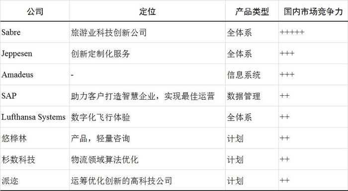 全球范围内,Sabre无疑是最大的航空算法优化解决方案供应商,拥有完整的算法优化解决方案;Amadeus与其类似;其余的国际算法优化供应商还有JEPPESEN、SAP、Llamsoft、达美技术、汉莎技术。这些海外算法优化公司或没有系统性的产品,或主要提供数据与信息系统服务,由于中国市场的独特性,海外公司在中国算法优化市场渗透率并不大。国内新兴的运筹学算法优化供应商大致分三类,仅提供算法支持、提供算法和系统、仅提供工具支持。主要代表有悠桦林、杉数科技,派迩。