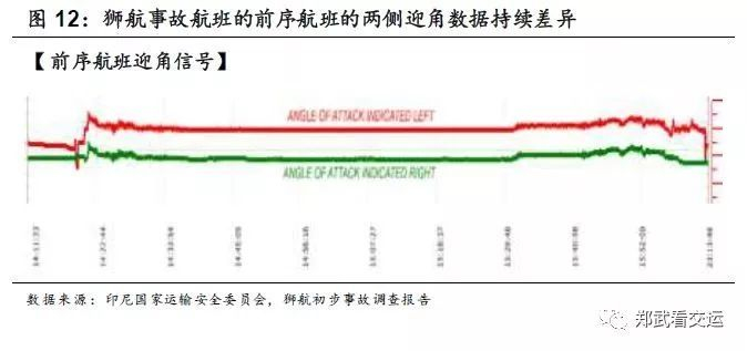 根据电子飞行数据记录仪的记录,狮航事故航班与其前序航班均出现了持续的迎角信号故障——两侧迎角信号明显差异,错误的迎角信号触发了MCAS反复操控机头下俯。前序航班机组执行了“安定面失控非正常检查单”——切断了安定面配平电门,最终平安落地。