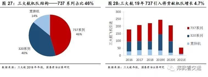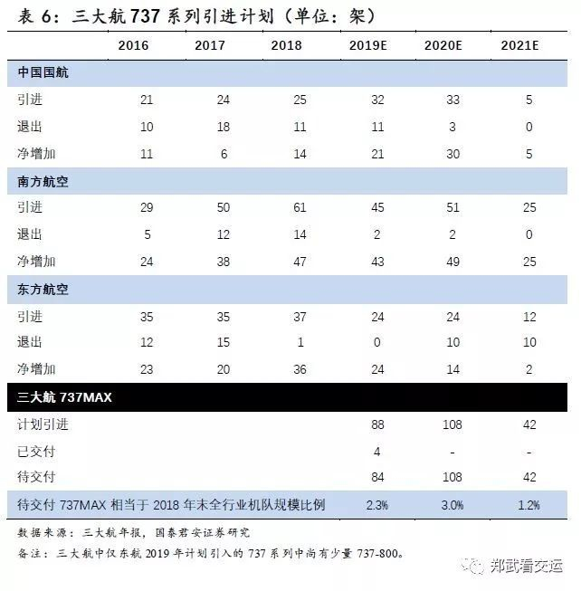 全行业737系列机队中三大航占比约65%,假设2019年引入计划仍保持该比例,匡算2019年全行业尚未交付的737MAX约128架,相当于全行业机队规模的3.5%。