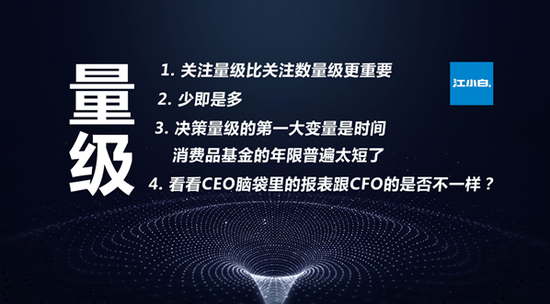 首先第一点,投资人达到量级后才能找到替用者。创业初期,我们只有几个人,什么都得自己来,司机、前台都是自己来。但现在我们已经吸引到大量人才,搭建了团队,不用事无巨细,事必躬亲。曾国藩讲过,但凡成大事必须要找到替用者。意思就是,企业、创始人或者投资人只有达到量级变化,才有可能找到替用者。当思维停留在数量级层面时,经营者未突破量级,不太可能找到替用者。